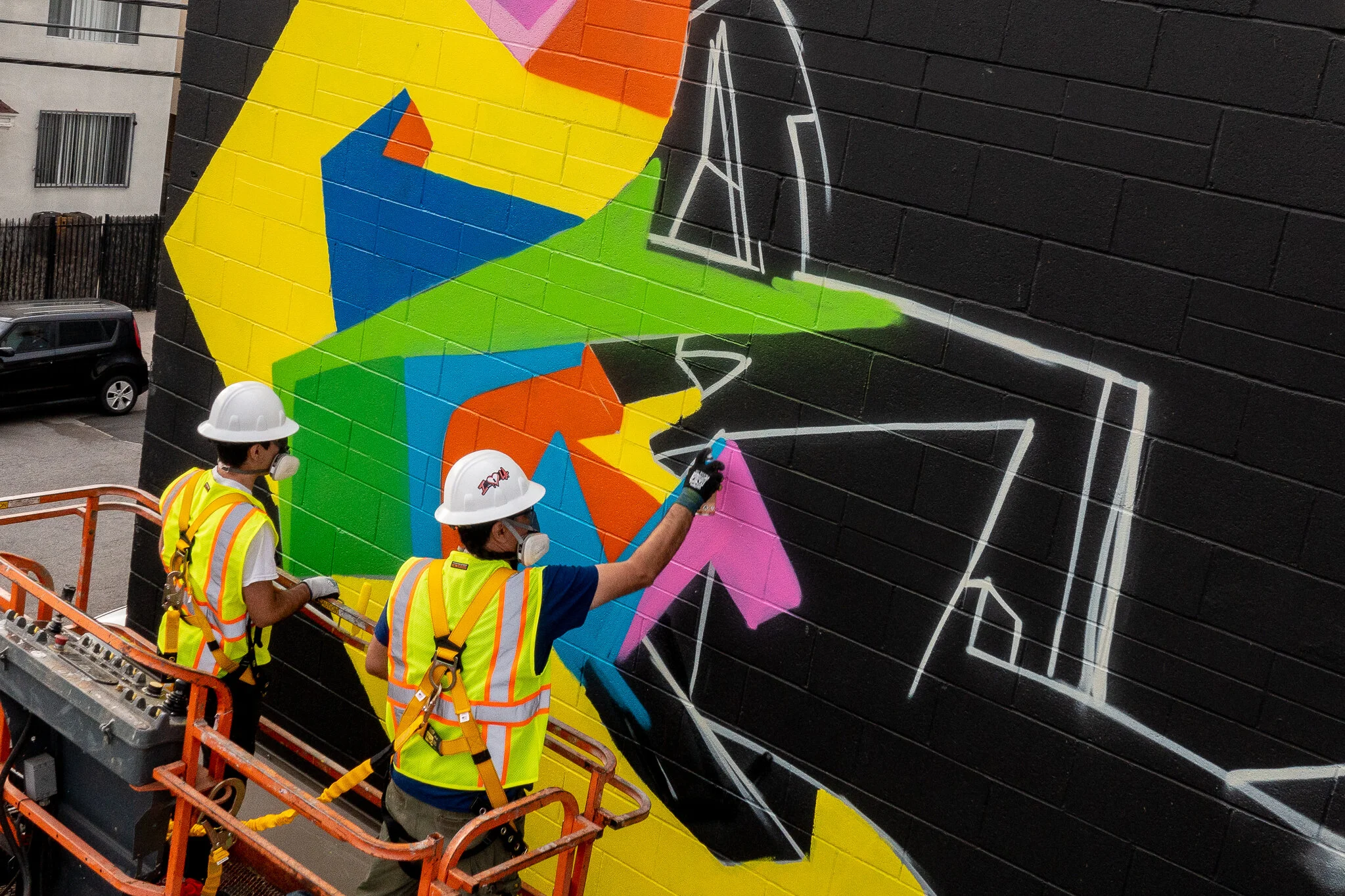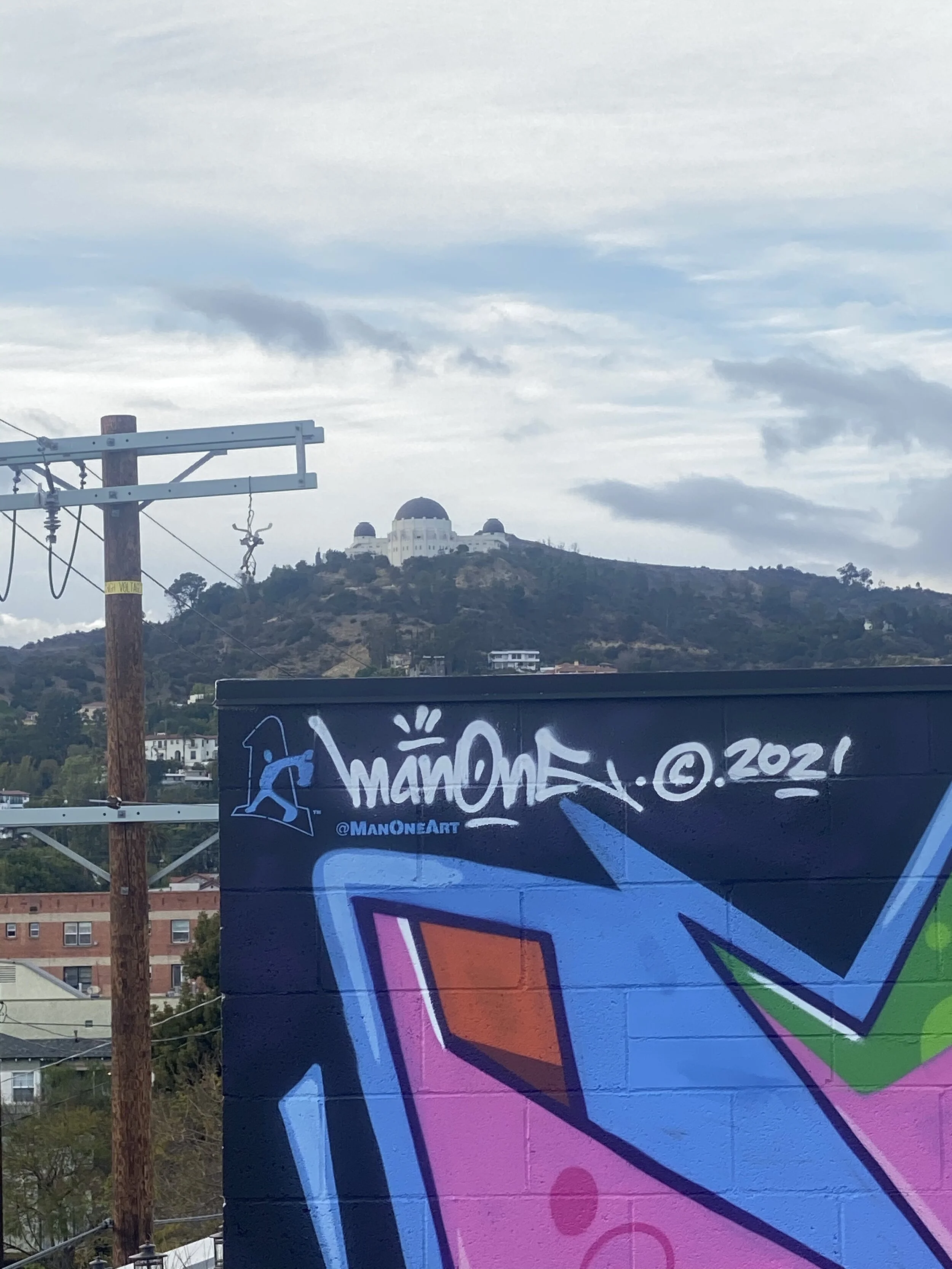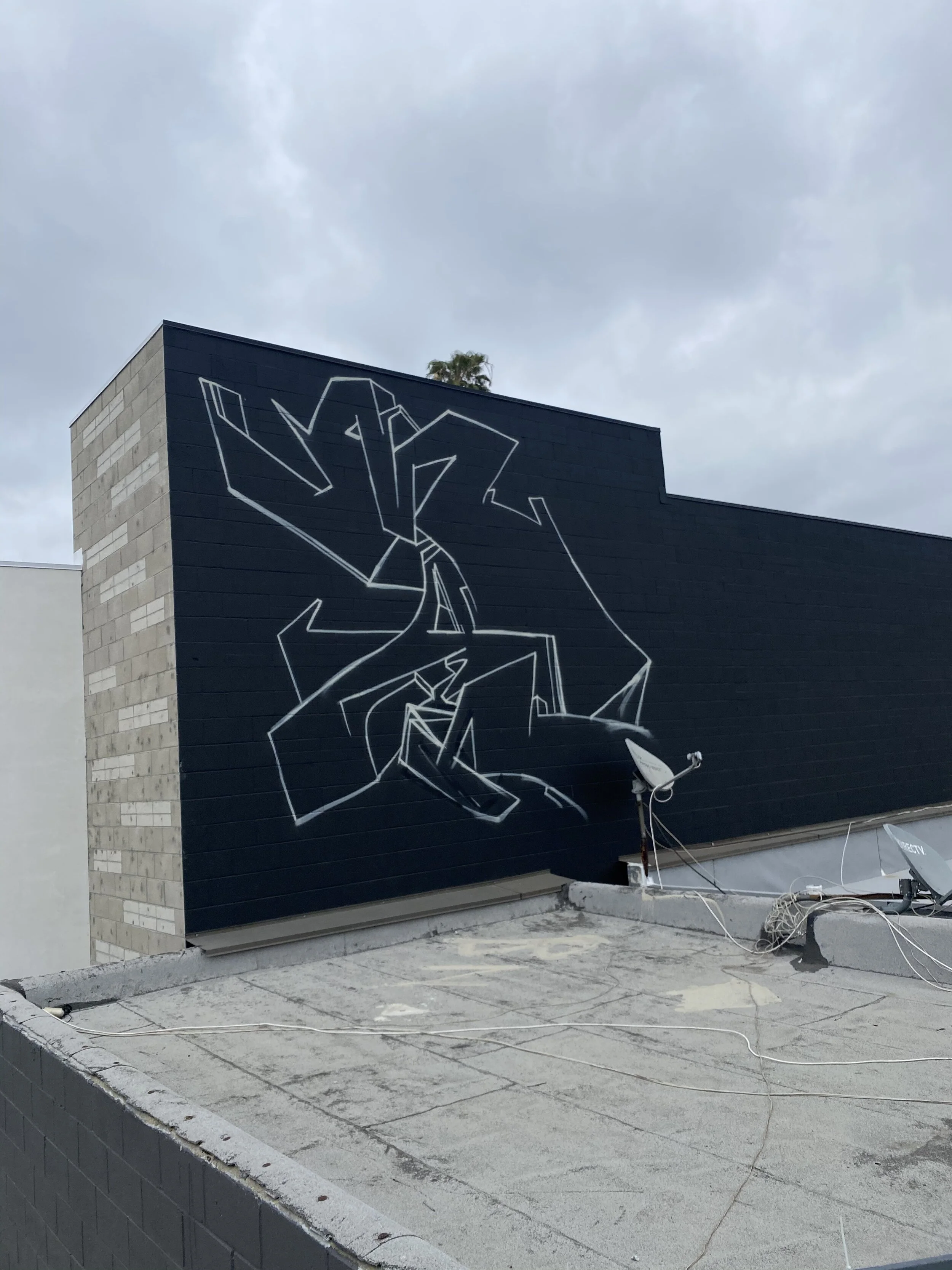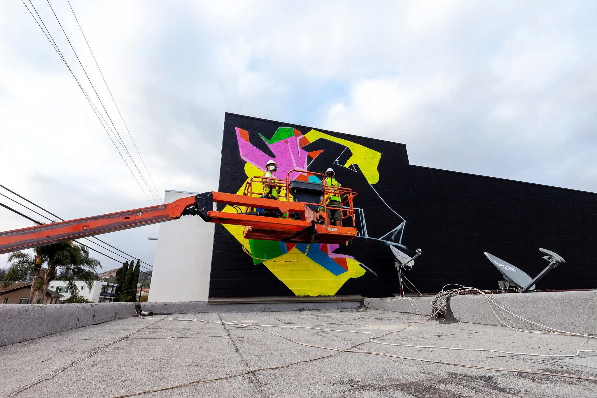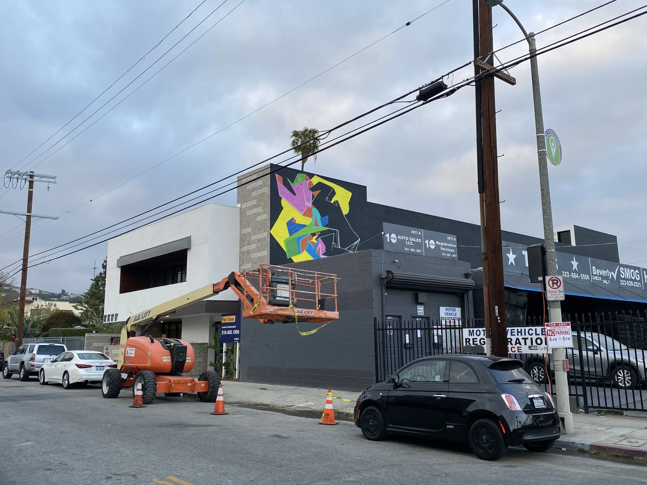 I was hired to create a colorful mural by the developers of this new commercial space on Alexandria just off Hollywood Blvd. The production of the mural was a bit tricky since we did not have access to the roof of the adjoining business so it was all done using a 60 foot knuckle boom.