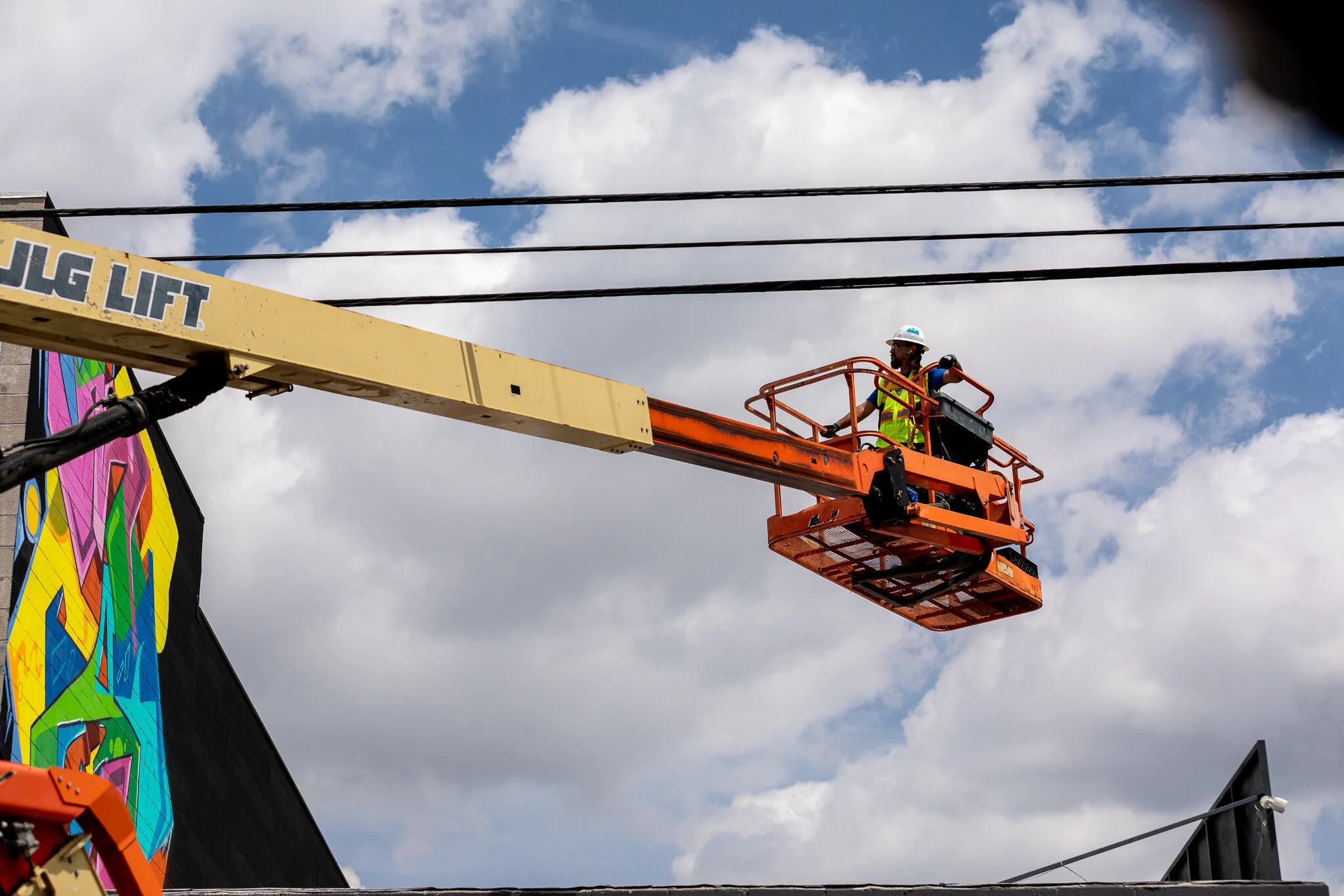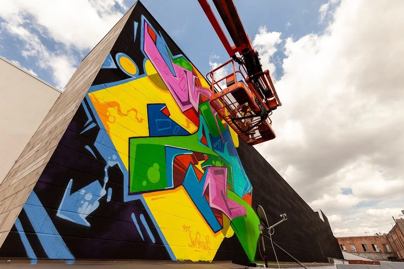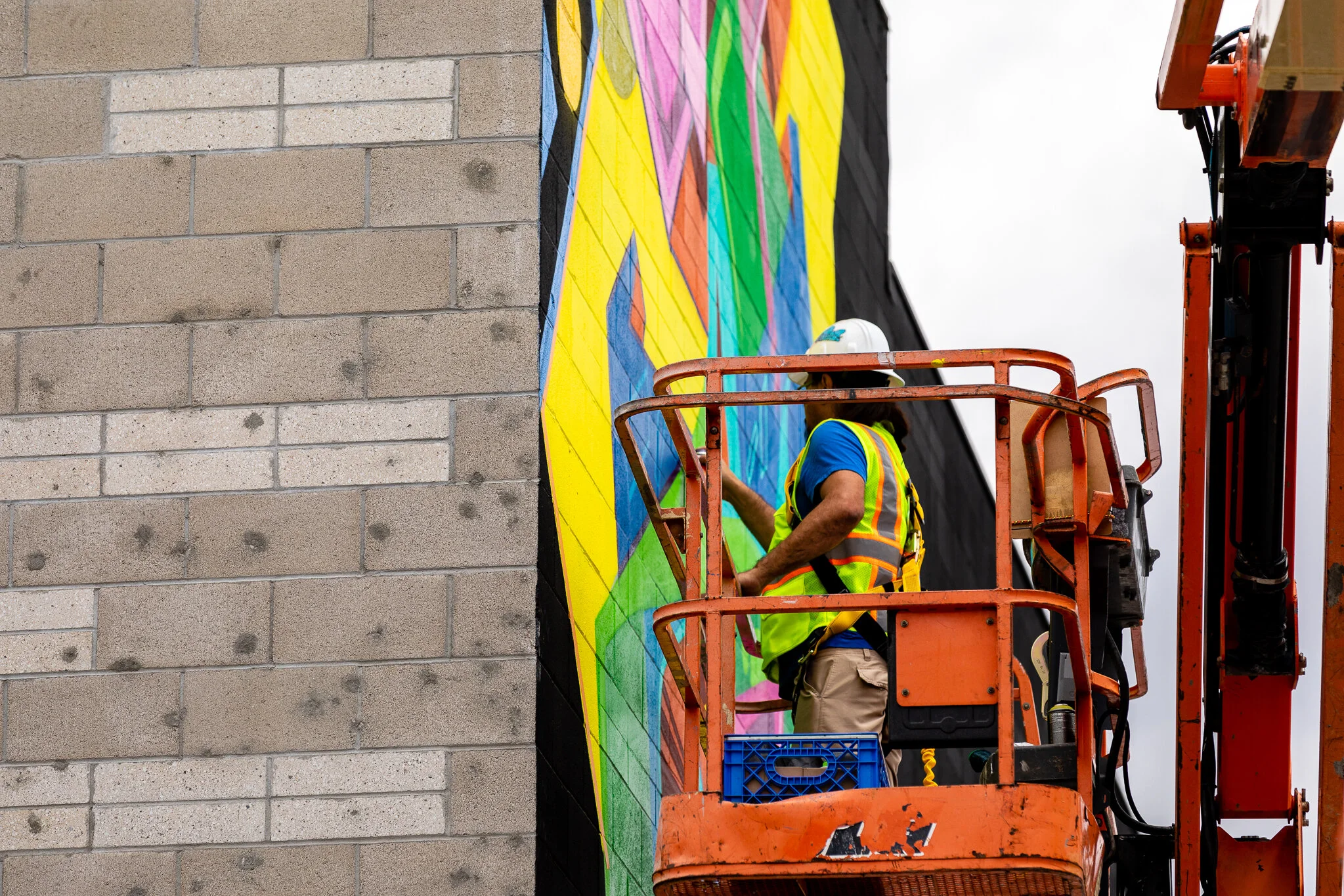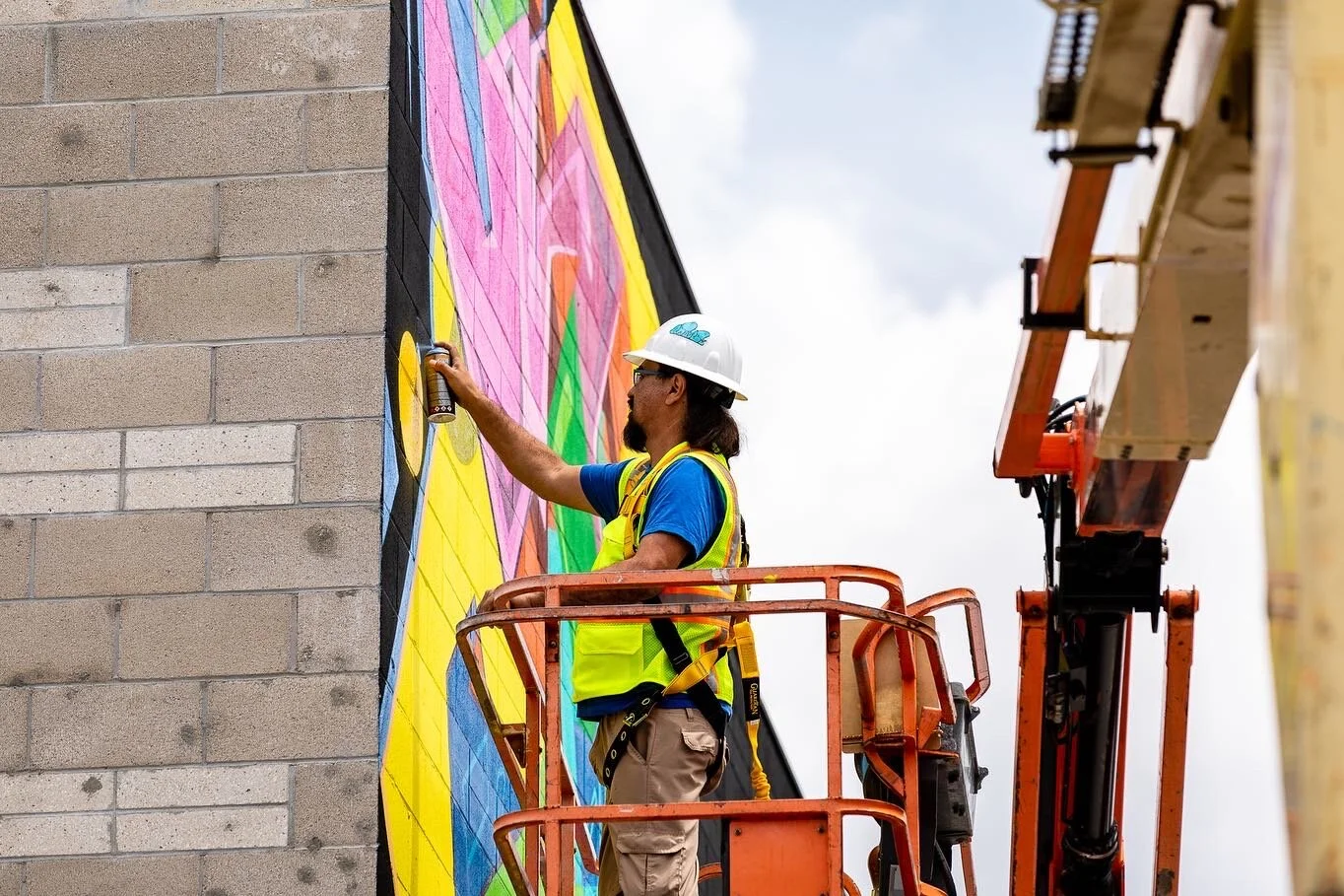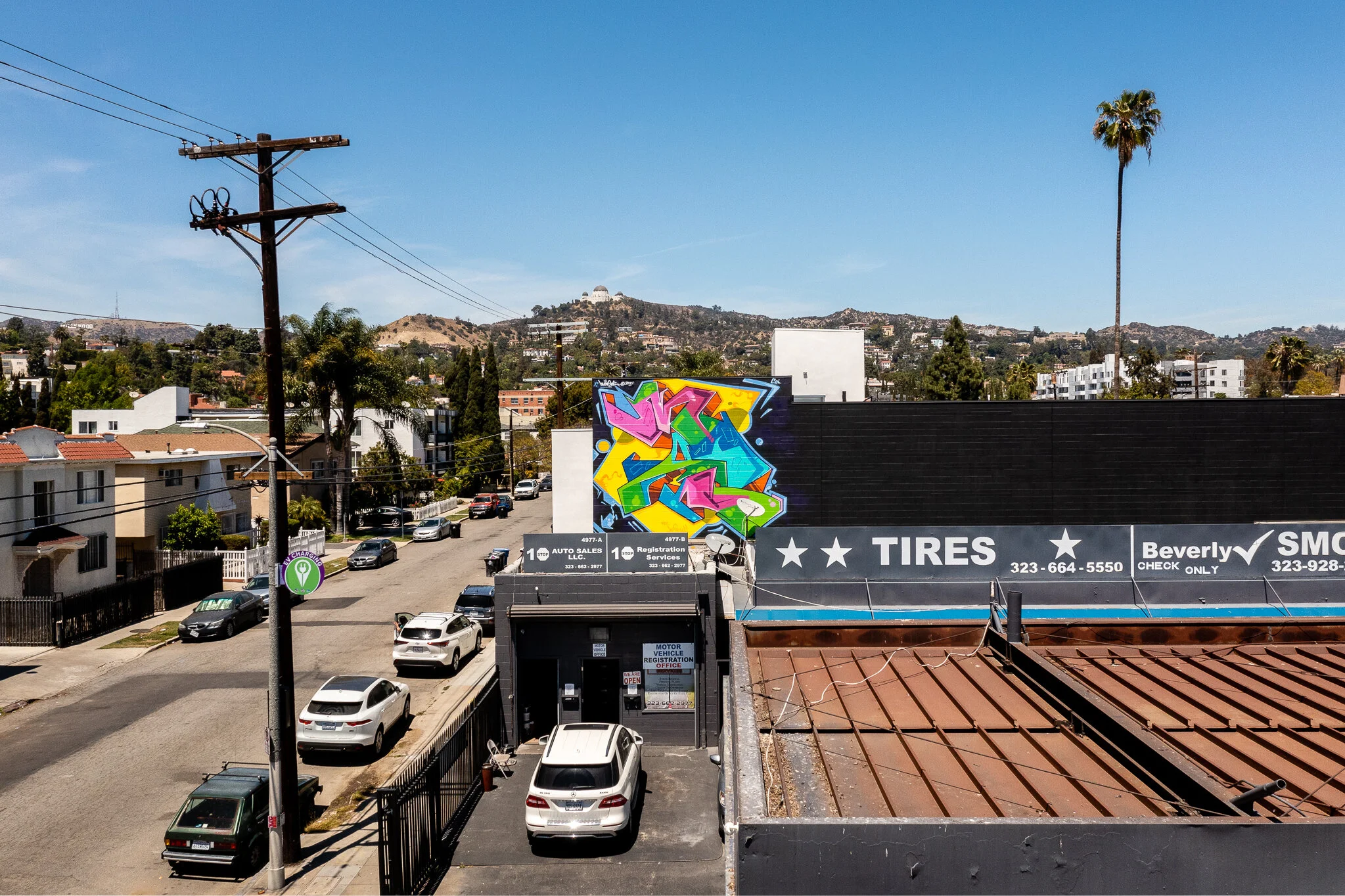 I was hired to create a colorful mural by the developers of this new commercial space on Alexandria just off Hollywood Blvd. The production of the mural was a bit tricky since we did not have access to the roof of the adjoining business so it was all done using a 60 foot knuckle boom.
