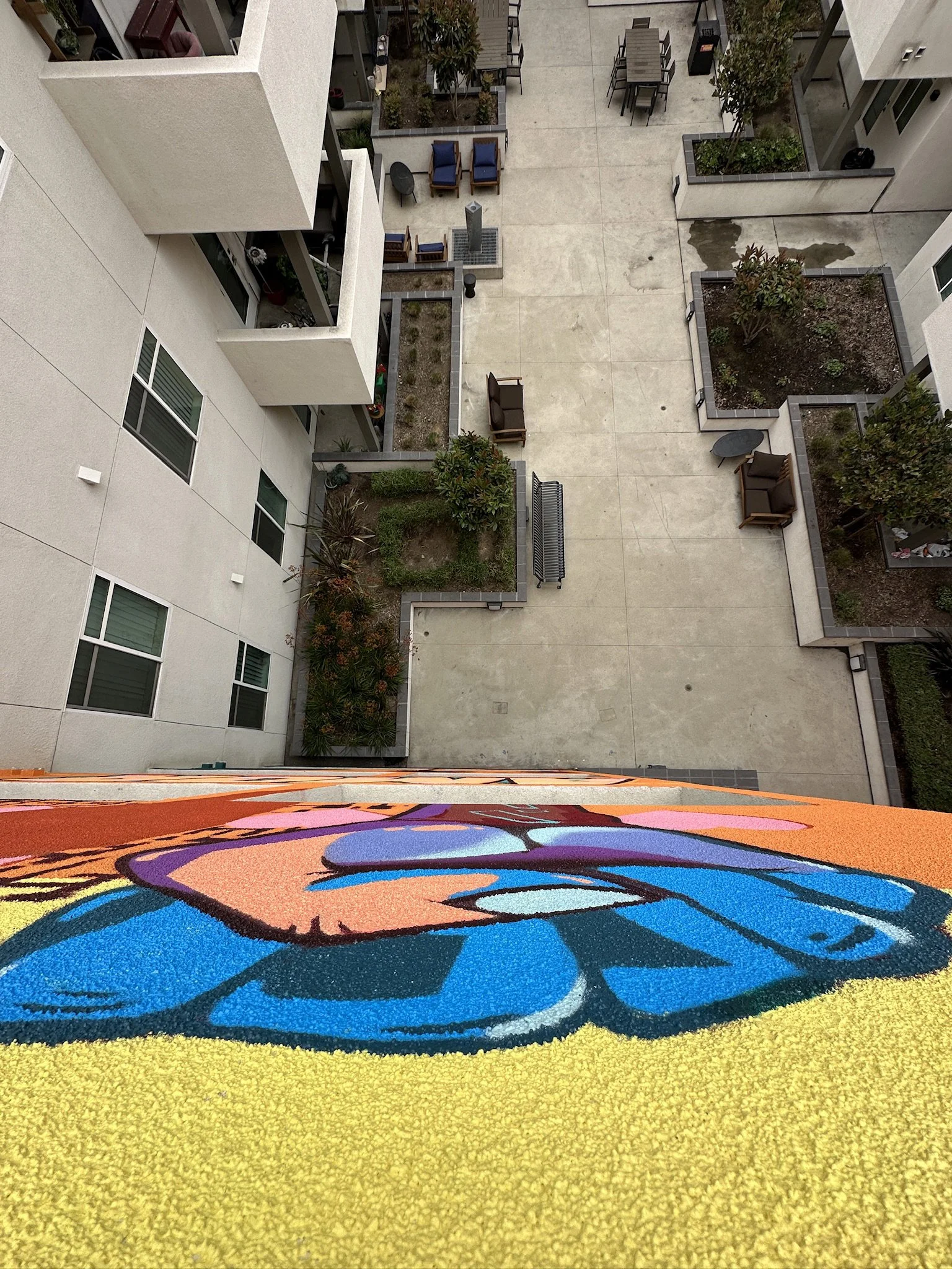 Commissioned by BRIDGE Housing, this community based mural was created with the input of residents and community members at Park Place in Watts. The entire building was originally painted white and was looking very sterile and plain. The team decided that painting the interior atrium of the apartment complex would be the most impactful. On a sunny afternoon, about 45 community residents and stakeholders joined Man One to brainstorm concepts and themes of what was possible on this 5 story building. Dozens of designs were created and many concepts and ideas were discussed. At the end, Man One took the community sketches and notes and created the mural you see below.