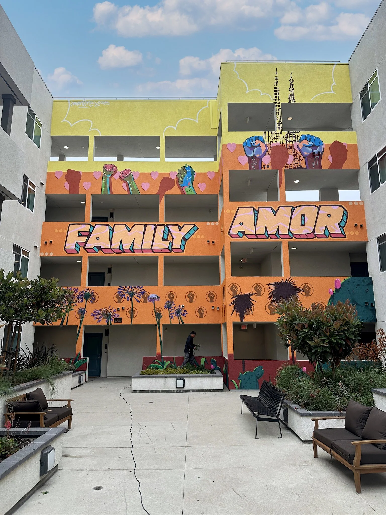 The final mural design has a unifying message of family, love, strength and culture. Each level of the mural emphasizes different aspects of community life. African lillies, Mexican nopales and palm trees grow from the ground level with the famous fist of resistance stamped in the background. Colorful letters with the words “family” and “amor” emerge on the next floor. On the fourth level, raised fists cheer in celebration and unity as expressed by Man One’s stylistic choice of multi colored hands and arms. A wave of pink hearts float in the background as the Watts Towers project themselves onto the top floor. The yellow sky covers the entire fifth floor as white outlines of clouds frame the field of color. Watts has always been comprised of proud, creative and resilient people. This mural honors that.
