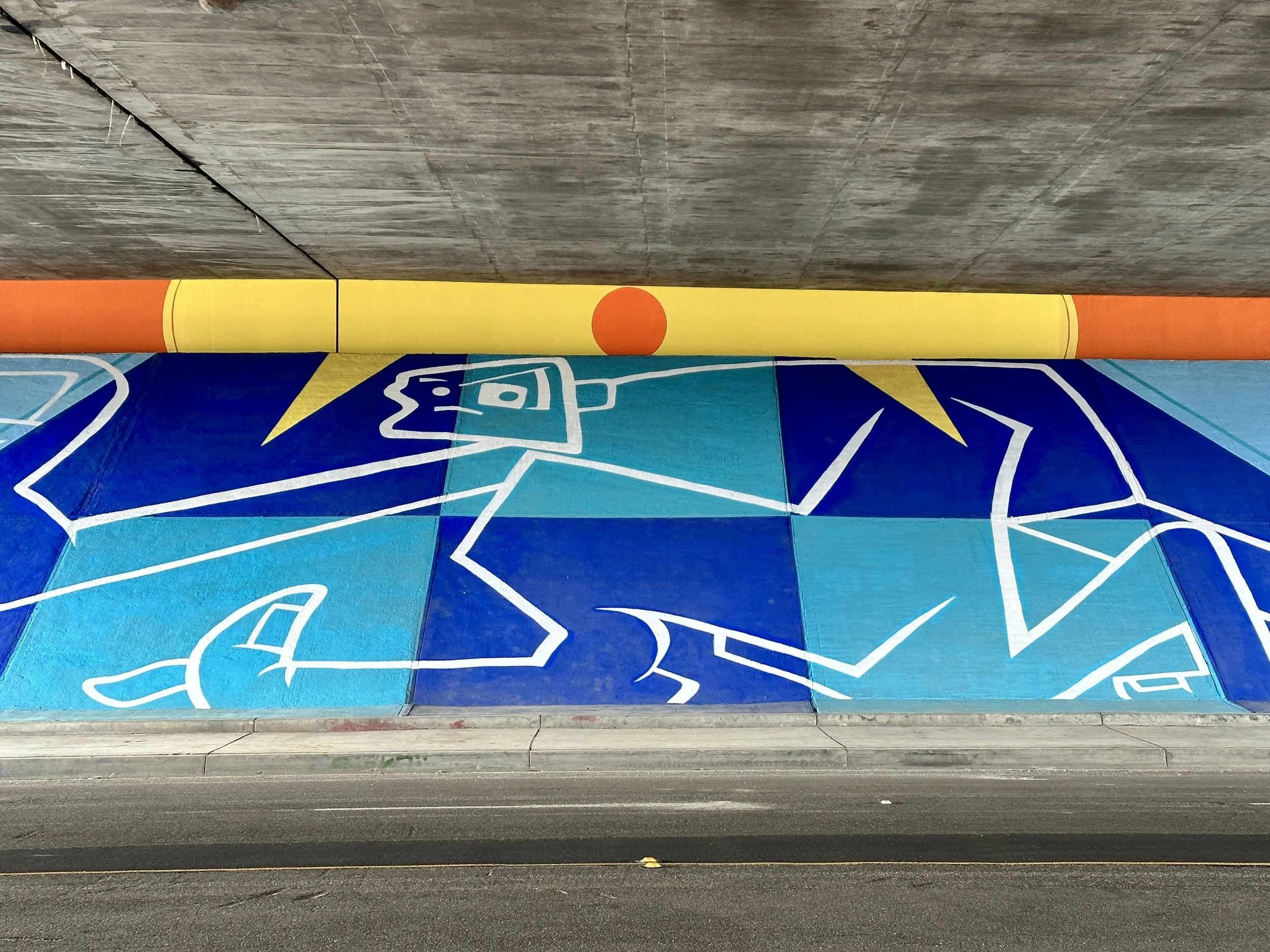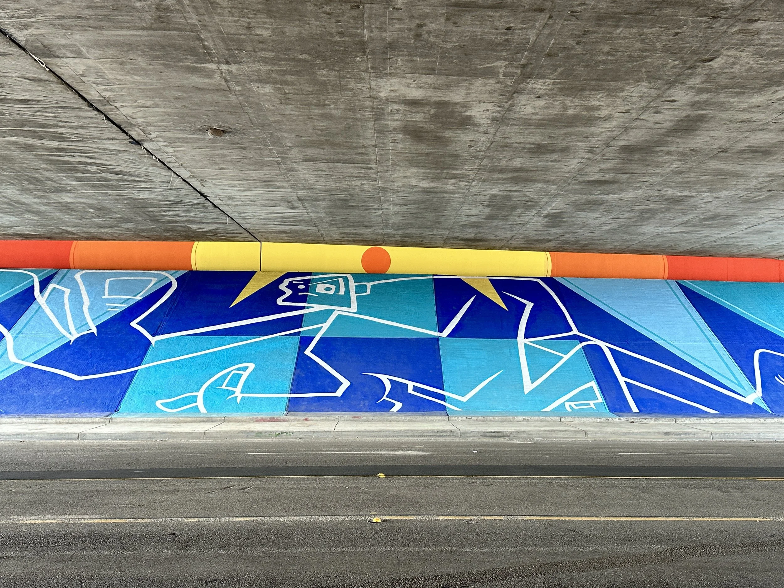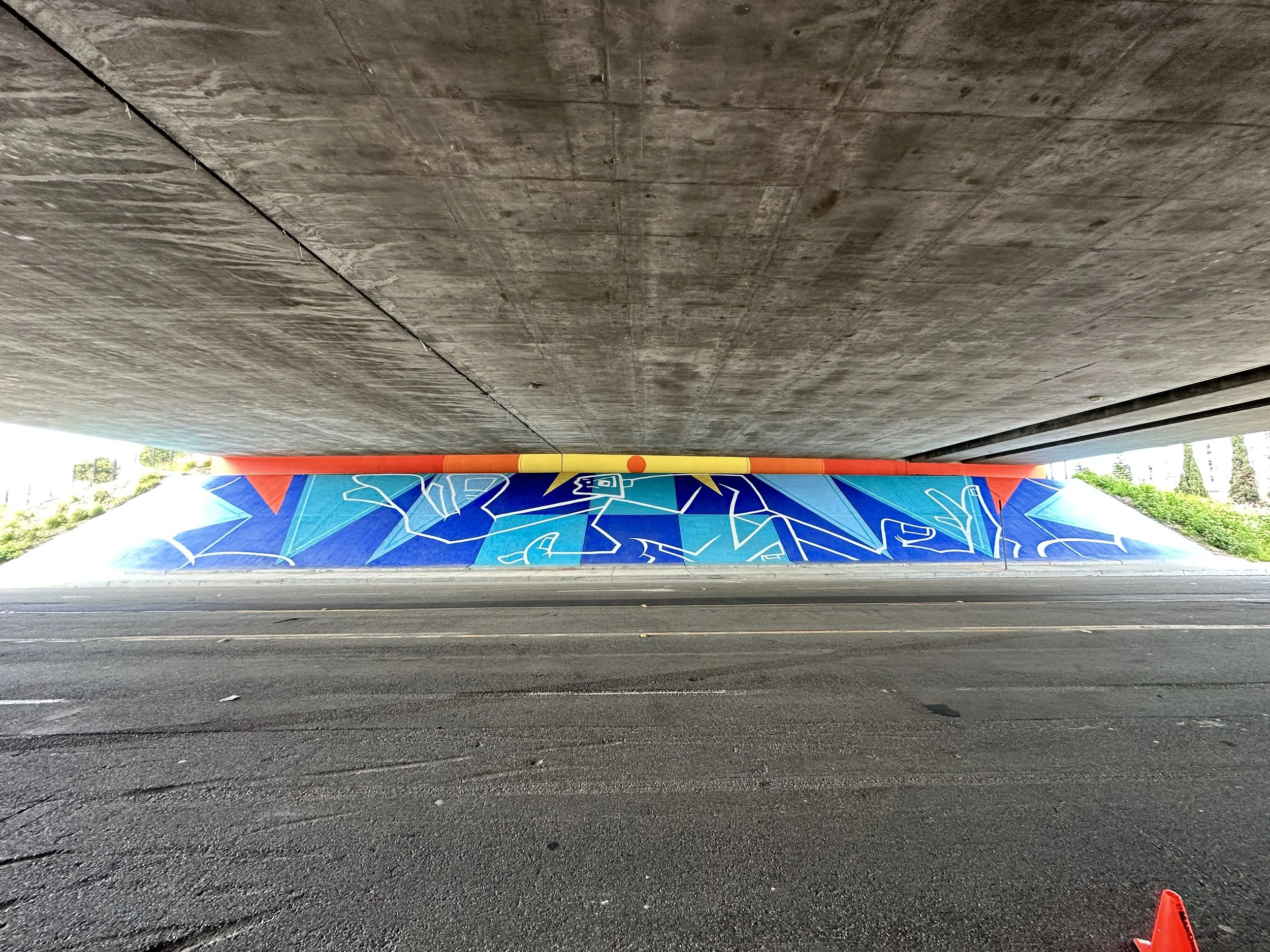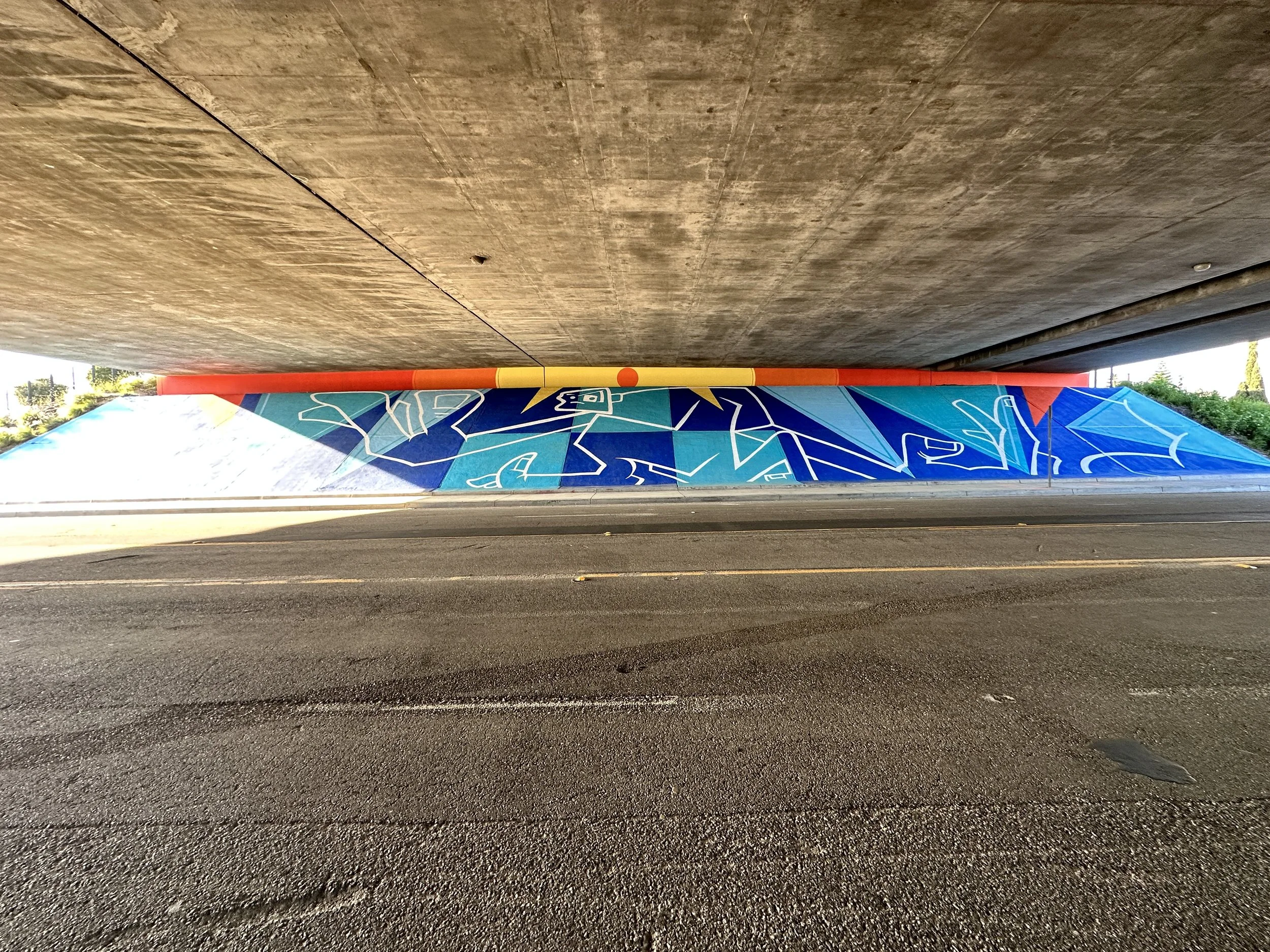 Mural by Man One: "The Good People Under Our Sun and Moon" Commissioned by the city of Placentia, California. The theme of the mural is based on the mythology of the sun and the moon and how it relates to our current views on housing, shelter, and community. The murals are located on both sides of Crowther under the 57 freeway. Each mural measures 185'w X 29'h and took over 80 gallons of paint to complete.