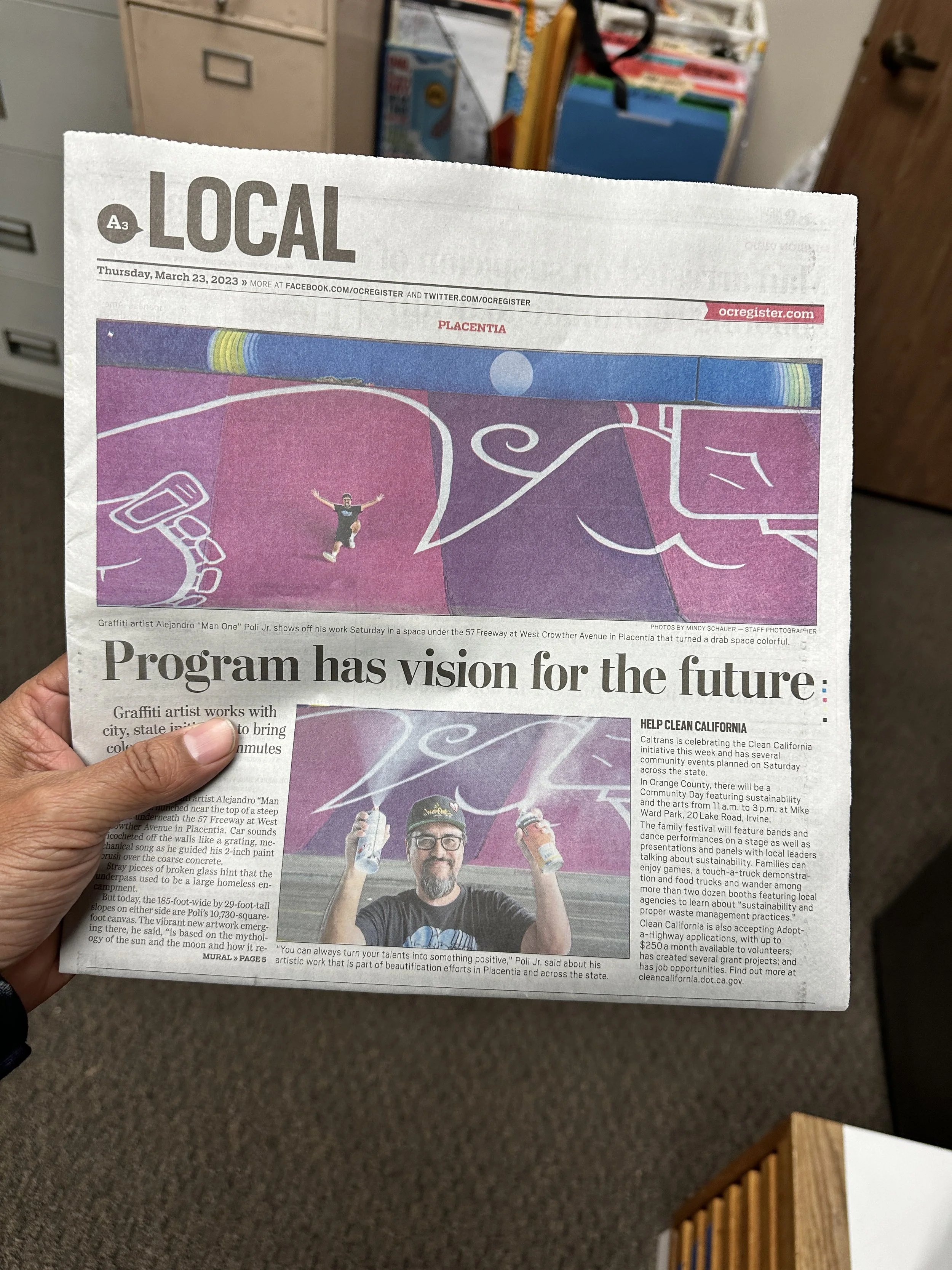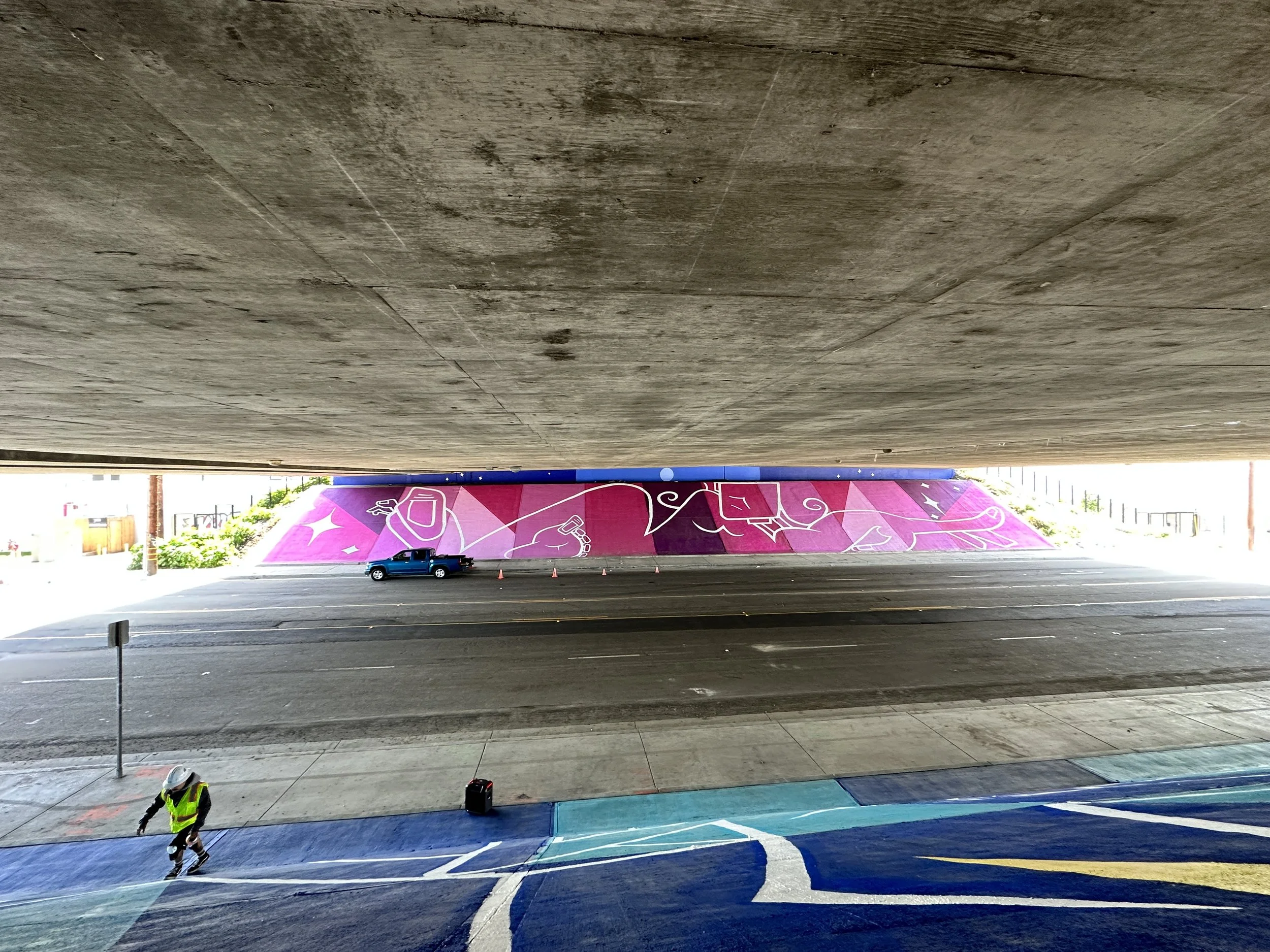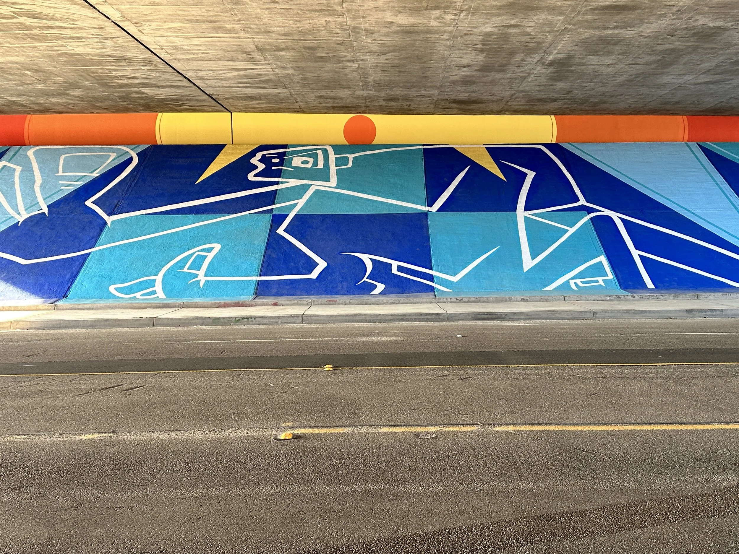 Mural by Man One: "The Good People Under Our Sun and Moon" Commissioned by the city of Placentia, California. The theme of the mural is based on the mythology of the sun and the moon and how it relates to our current views on housing, shelter, and community. The murals are located on both sides of Crowther under the 57 freeway. Each mural measures 185'w X 29'h and took over 80 gallons of paint to complete.