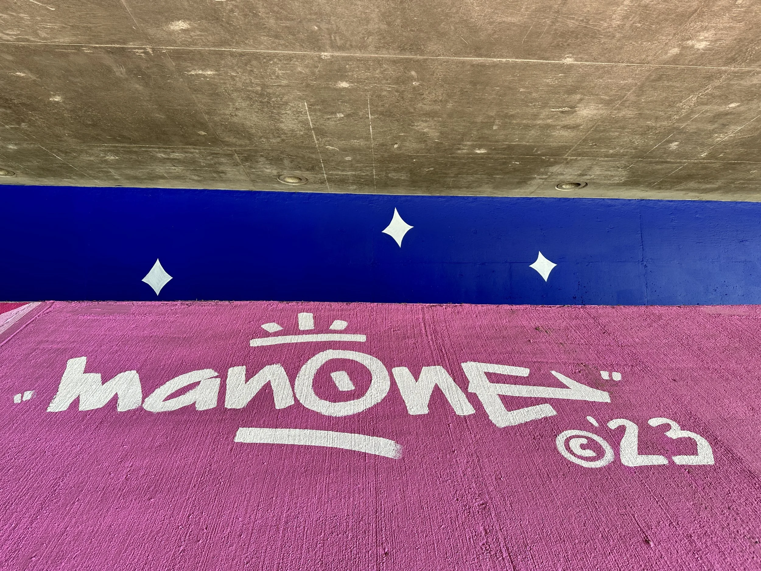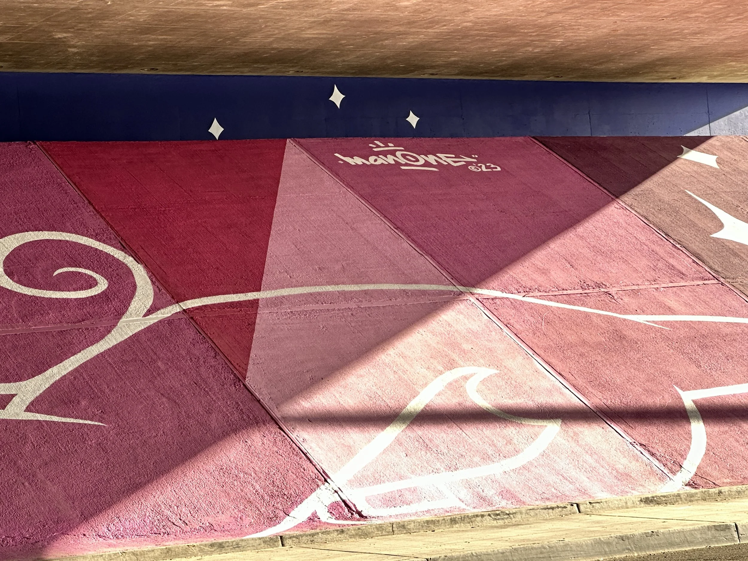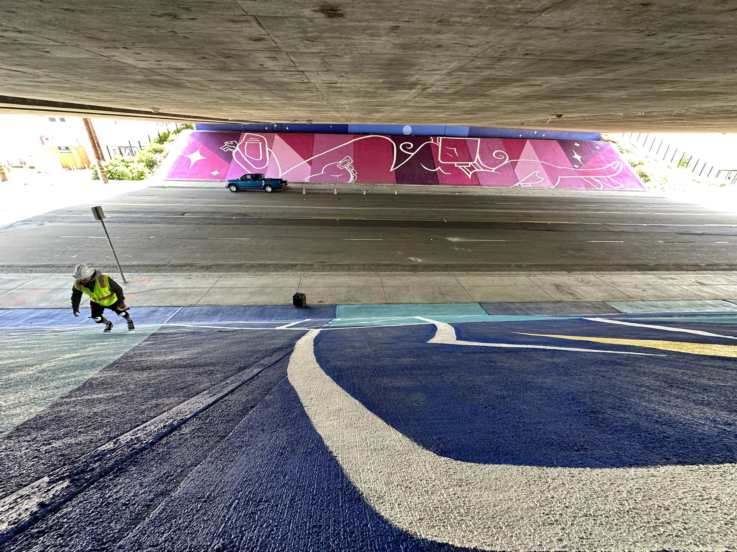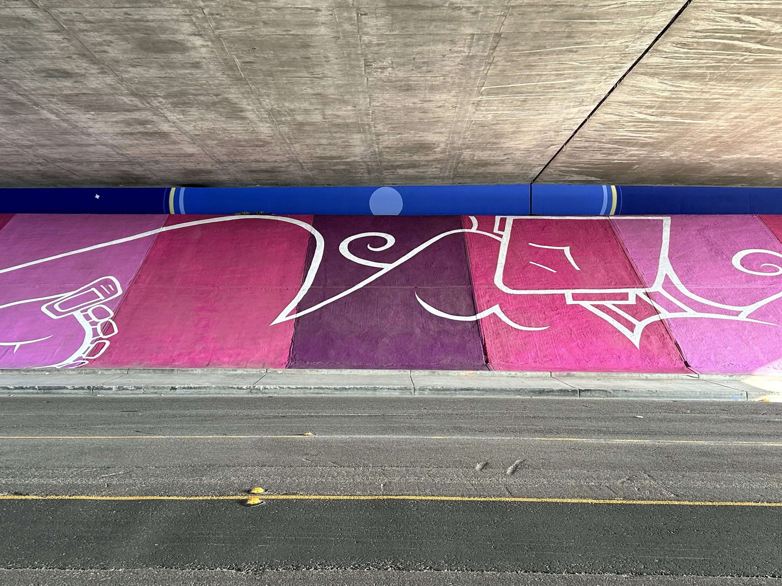 Mural by Man One: "The Good People Under Our Sun and Moon" Commissioned by the city of Placentia, California. The theme of the mural is based on the mythology of the sun and the moon and how it relates to our current views on housing, shelter, and community. The murals are located on both sides of Crowther under the 57 freeway. Each mural measures 185'w X 29'h and took over 80 gallons of paint to complete.